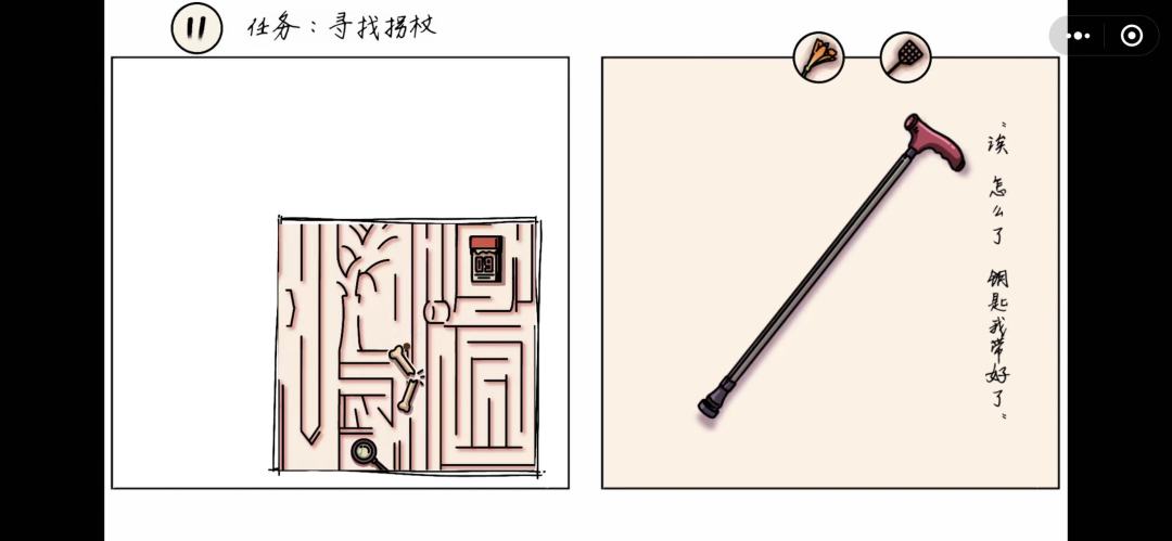 最后我们会需要找到拐杖,眼尖的玩家肯定已经发现了,实际上整个左边屏幕的迷宫都是以一个“家”为轮廓构成的,所以作为出门必备道具的就是拐杖,在门的旁边找到拐杖即可通过第一关。