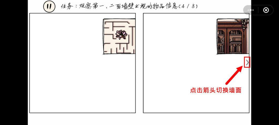 服药之后,我们的视野会变得比之前要大,这是症状缓解的象征。如果在找到药瓶之前你已经找到了第一面墙的四个红圈所代表的物件(鞋子、柜子里的摆件、雨伞、药瓶),那么此时你就可以点击屏幕右边的灰色箭头,转过身去观察第二面墙,找寻物品信息了。