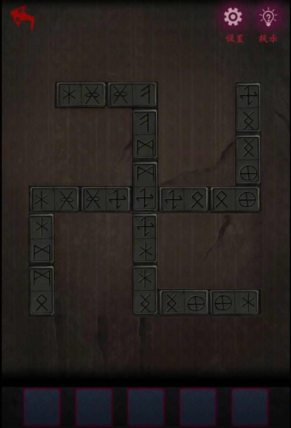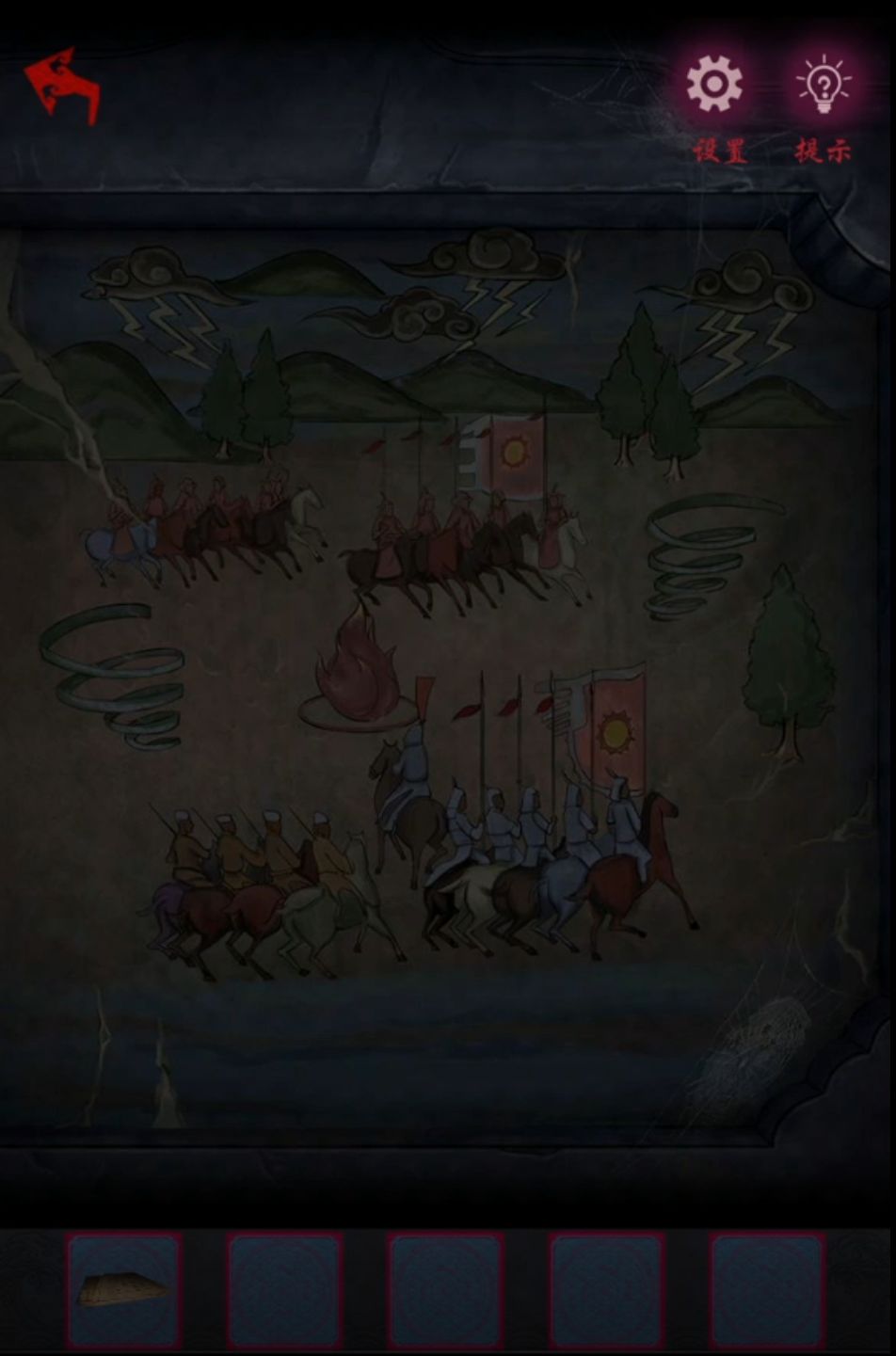 调整完拿到青铜印,出来密室在佛像房间刚刚红衣女摔门而去的门上有个方形空间,放上青铜印后就显示了提示,提示是风火云雷树山图案,那么能联想到的就是刚刚密室墙上的战争绘画了,要做的很简单就是数数,风2缕火一堆云4朵(中间混了个山)雷3道树6棵山5座,这个很明显没有重复数字是点击顺序,也就是需要按顺序点火风雷云山树。