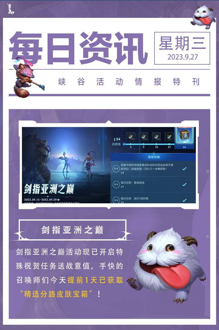 而我们游戏中的“剑指亚洲之巅”活动现已开启特殊祝贺任务送战意值,手快的召唤师们今天提前1天已获取“精选分路皮肤宝箱”!还等什么,召唤师们快快上线,为中国电竞加油,为中国健儿喝彩,领战旗、皮肤奖励!同时随着赛事的进行,特殊任务将会跟随赛果刷新,请召唤师们不要错过!记得来游戏内领取战意值!