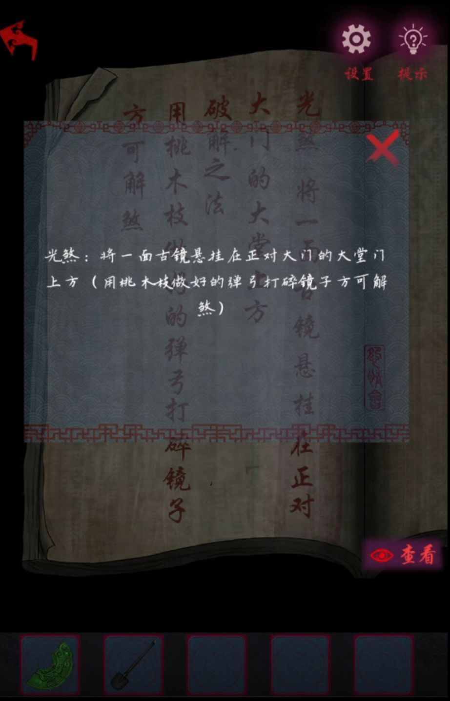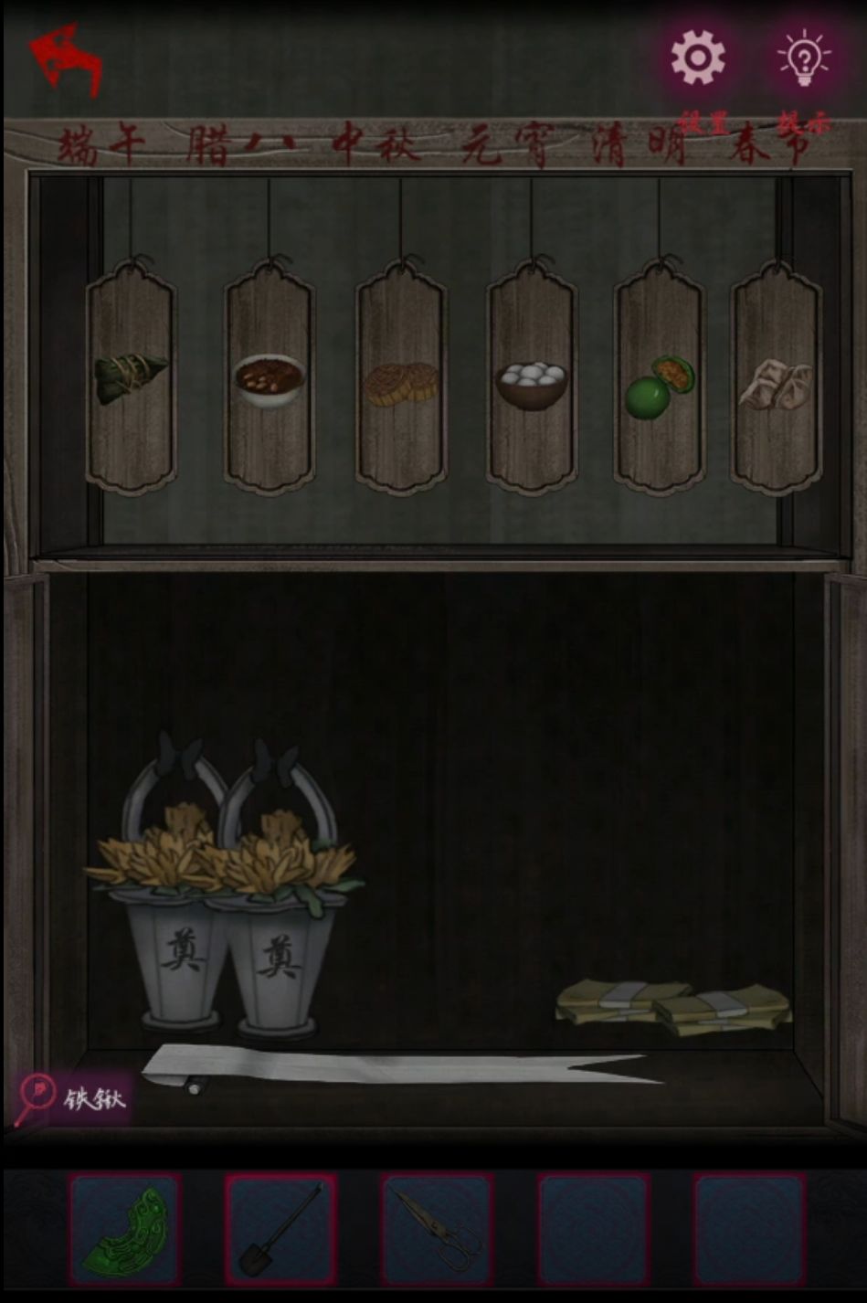 然后右下角柜子下面拿到一把铲子,正经人谁会在自己卧室放把铲子???柜子上面有本书写了各种布煞解煞方法,三页有点多,总结一下就是去假山上挂一串古钱,把门上镜子打碎,风铃从卧室拿到屋外,就算是章节目标吧。回到正房从棺材左边竹篮里拿到一把剪刀,回到庭院左边红衣女站的地方旁边有个柜子,上面是节日和食物的对应,这个米雪超熟!端午粽子腊八粥中秋月饼元宵汤圆清明青团春节水饺,什么节日都能吃五花肉!