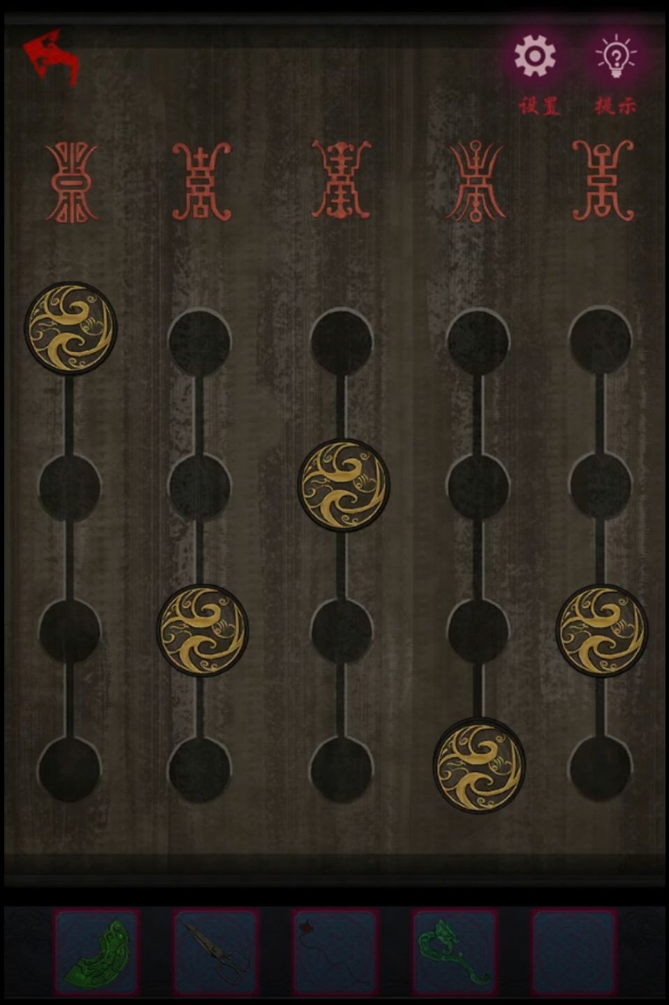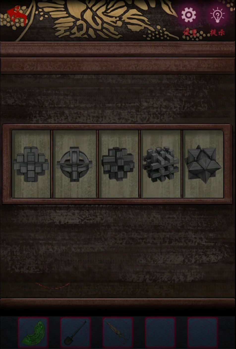 然后就可以出门开挖了,中间偏右上的桃树根部用铲子挖掘,挖到一根玉如意和一个盒子,盒子上的图案和卧室窗子上窗花的图案是一样的,顺序不太一样哦要记一下图案,调整盒子上窗花高度和窗子上一样就能打开盒子了,高度从高到低编号1234的话几个图案的高度为13243,用红线去穿盒子里的古钱就是五帝古钱了,话说下面吊穗是哪里来的,该不会是用剪刀现场剪出来的吧?