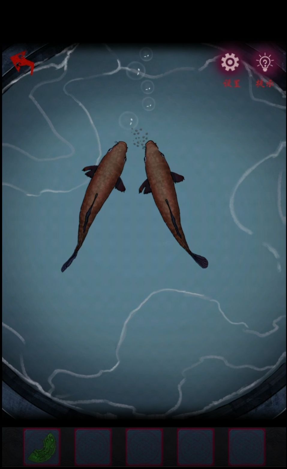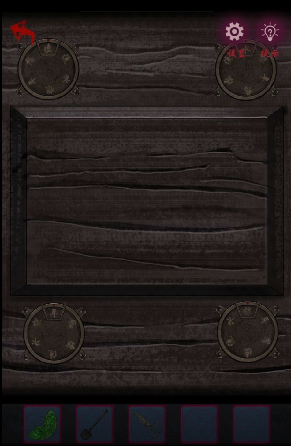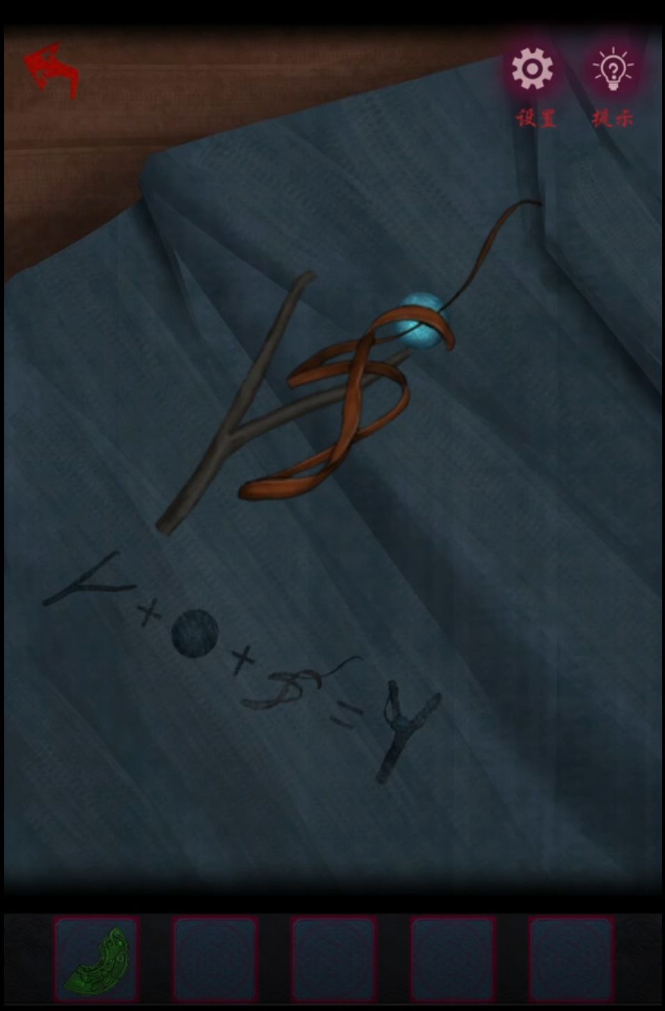 总之把小树枝和鹿脊筋拿到卧室都放在左侧桌子上就能自动组合为弹弓了,旁边有个蓝色石头是现成的弹丸,拿着这一套出门把正房门上的镜子打碎又完成一个,而且打碎镜子时候红衣女会飘过来阻止我们,这样左边门就可以进了。进门先看一眼左边亭子里的桌上有个翻翻乐,点击顺序依次为2-1,3-3,1-3,3-4,3-3,4-2就可以全部翻开了,拿到鱼食。