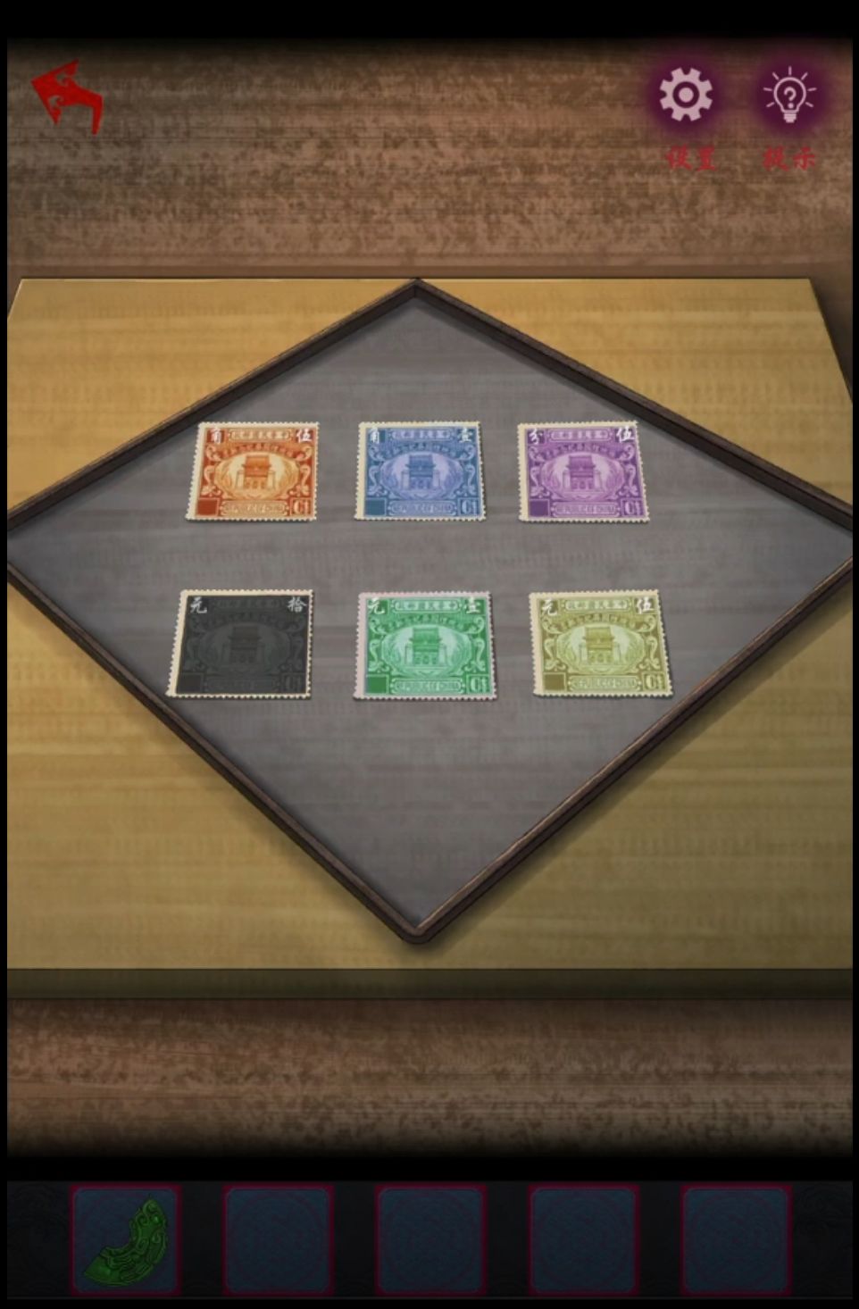 继续调查梳妆台上的方盒子,把两张邮票放进去就齐了,注意邮票面值是不同的,记下颜色和面值:橙色0.5,蓝色0.1,紫色0.05,黑色10,绿色1,黄色5,所以从小到大的话颜色顺序就是紫蓝橙绿黄黑了,按照这个顺序点击镜子左下角的宝石盒,打开获得另外一半玉佩。两个玉佩都拼在床上的盒子上,打开盒子获得香囊,把香囊交给窗旁的红衣女她就开心的找地方照镜子去了,然后拿走风铃挂到后院小亭子上,所有煞气都消失了前往下一章。