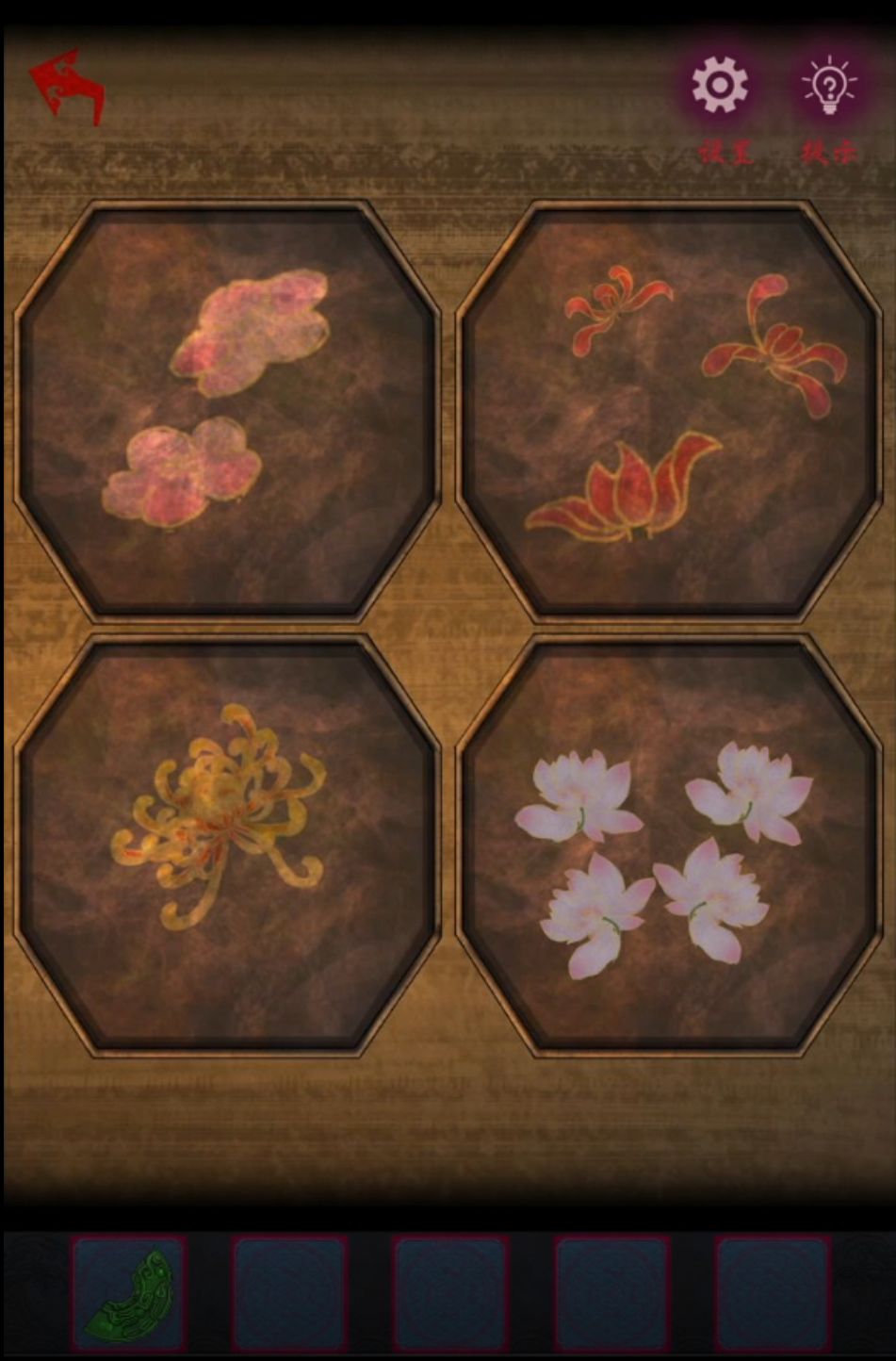 之后就可以探索未婚妻闺房了,正中间屏风上很显眼的提示春天兰花夏天荷花秋天菊花冬天梅花,感觉兰花改成迎春花更合适一点emmm然后调查一下左边桌子上有四个化妆盒,盒子上的图案分别是2朵梅花,3朵兰花,1朵菊花和4朵荷花,记下来。