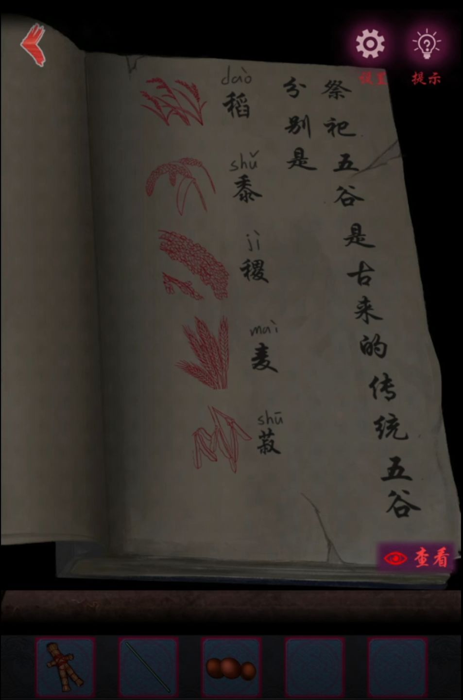 进入祠堂发现红衣女子本体倒在地上气绝身亡了,旁边柜子拿到草人,供桌上拿到筷子和红鸡蛋,旁边书上画着五谷,如果有认识的这里就不用管了,感觉大多数小伙伴应该是不认识的,画下来吧,五谷杂粮现在吃的还比较多的就是稻和麦了。