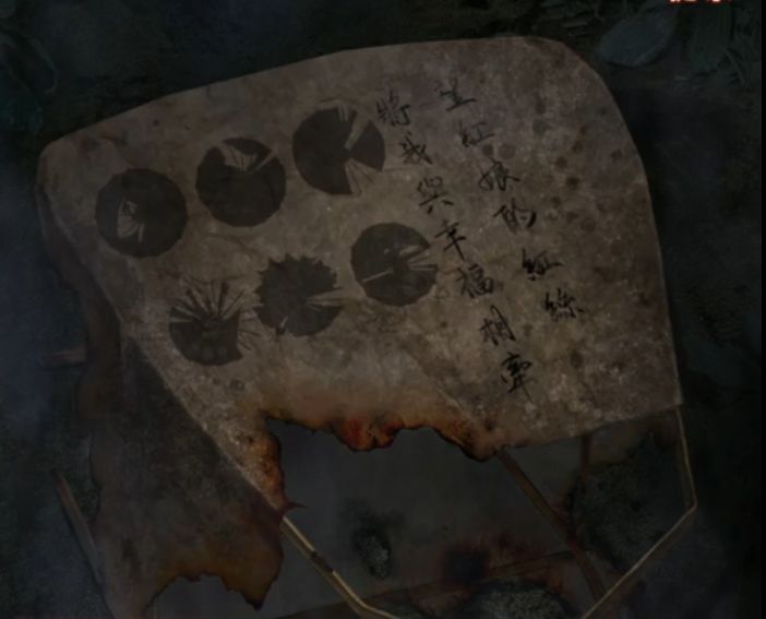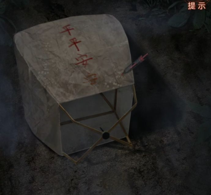 有了梆子我们终于可以调整到三更了,锣+梆子+锣,注意调整完有高能,黑白无常鞠了个躬,三更已到,人点......不对串戏了,调整完毕后庙门开了但是不着急进去,先回到最初场景,可以看到掉下来的残破孔明灯,上面的图案肯定就是线索了记下来。