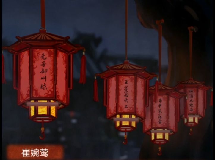 不着急离开现在时间是二更还有木偶戏,调查一下木偶戏台木偶要一双漂亮的绣花鞋,把绣花鞋盒放在中间,木偶返还了一个香囊又要一盒胭脂,回到第一个场景,先把龙糖画放在生肖灯笼上,这样十二生肖就齐了,然后用火柴点亮请柬背面的兔子、老鼠、龙、猪、羊就能获得一个老虎布偶,来到许愿树下把刚刚拿到的老虎布偶、香囊、福字吊坠依次给灯谜挂上,树下突然出现个纸人给我们拿来了锣棒。