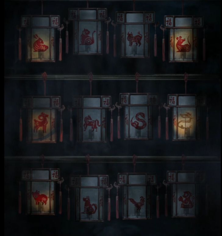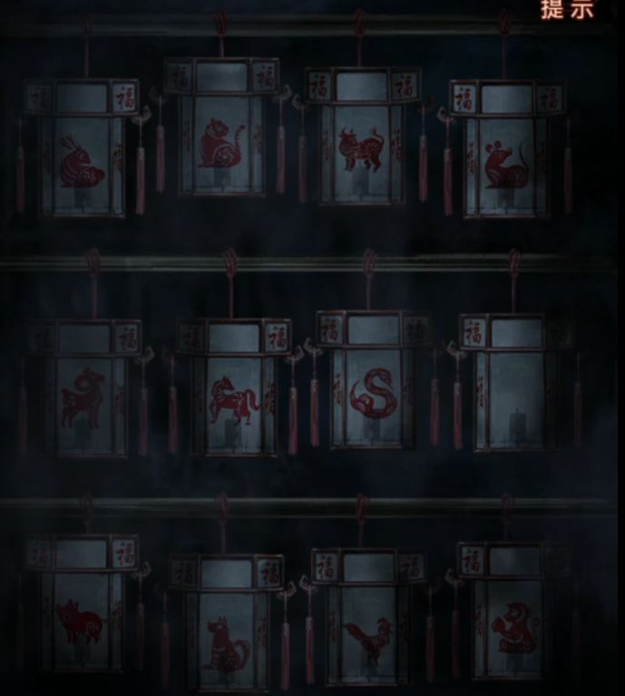 然后往左边走吧,从街道名牌上拿到一个福字吊坠,看到黑白无常的三个更字灯笼和锣基本就猜到了是个需要手动调整时间来解密的地方,不过不让我们用手敲,上一任明明随便捡一根小树枝就能敲!凭什么不让我们折一根树枝敲?调查轿子里面,请柬的背面有一半的密码和几个生肖图案,一半的密码又是熟悉的鬼画符,小本本准备好了吗?生肖是剪纸版本的兔子、老鼠、龙、猪、羊。