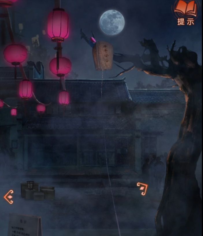 然后敲4下锣改时间到二更,用剪刀剪断旁边风筝顺走风筝线,再敲2下锣时间改回一更,来到最初场景,把小蜡烛和风筝线都放在孔明灯上,用火柴点燃孔明灯,用风筝线控制孔明灯取下树上的胭脂,这个真的挺有创意的。然后再回左边敲4下锣时间到二更,回到右边木偶戏把胭脂给木偶,木偶还了个梆子,然后要红线。