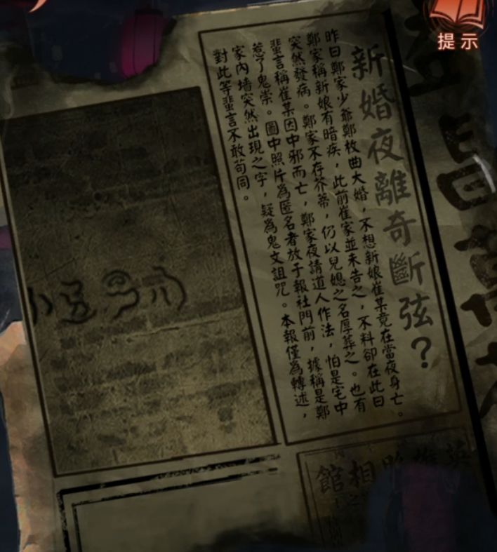 然而本要与幸福相牵的木偶却一瞬间吊了起来,拿到用红绳拴住脖子的新娘人偶,回到灯谜树下挂在第一个灯笼下灯笼突然暗了下来,拿到一张新的旧报纸,旧报纸左侧有另外的一半鬼画符,因为前面隐约露出了前一半所以这是后一半,结合起来回到轿子旁边开始调整吧,调整完毕看剧情下一章。