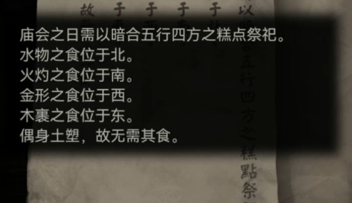 完成后拿到一串铜钱,回到右侧场景用铜钱去买点心,再拿着点心回到庙中,礼盒中的点心是烤牛肉、鱼形糕、元宝糕、叶子糕,所以到底哪里的特产里面既有烤牛肉这么豪放的食材又有软糯的糕点啊!总之按照水里的食物鱼形糕在北,火做出来的食物烤牛肉在南,金形状的食物元宝糕在西,木包裹的食物粽子叶子糕在东摆放完毕后神像的嘴就张开了,直接解下红绳,敲4下锣来到二更,把红绳拿给木偶继续剧情。