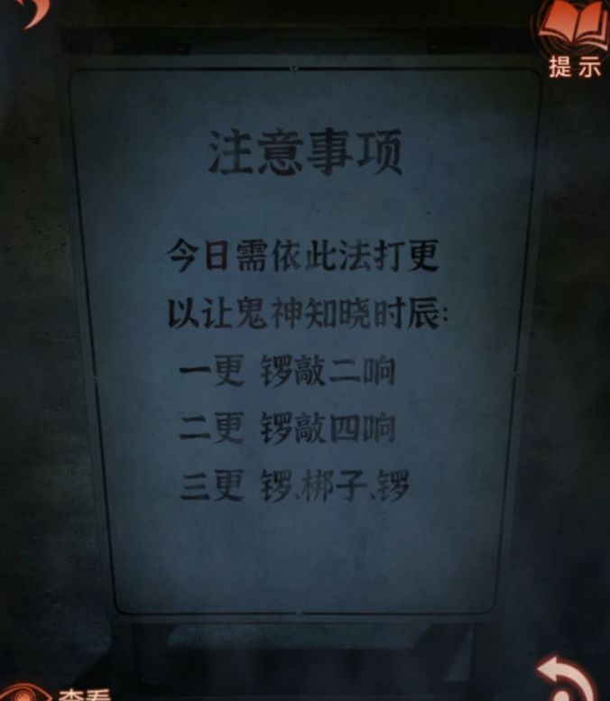 剧情过后先从后面糖葫芦车上摸个糖葫芦,这个糖葫芦可是帮了大忙的,然后看一下最前面的公告板,首先是第一个重点每个时辰内容不同,一更是孔明灯,二更是猜灯谜和木偶戏,三更开庙。然后每个时辰的打更不同,一更是2下锣,二更是4下锣,三更是锣+棒子+锣,记好就可以继续探索了。