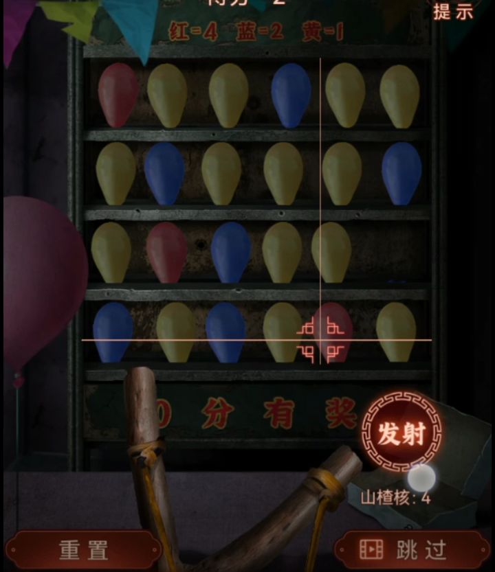 按照顺序拉动宫灯挂穗从里面拿到剪刀和一个纸元宝,纸元宝自然是找左边摊位换面具,然后来到右边摊位把面具给锤年糕小人让他不要懒了快干活,把山楂锤碎拿到山楂核,总觉得吃掉不是一样吗??再回到左边射气球摊位,用山楂核当弹丸开始射气球,下面写了十分有奖,所以最简单就是2个红气球+1个蓝气球,没有时间限制所以不用着急,等准星到位置点发射即可,完成后左边气球炸开拿到一小截蜡烛,主角也是吐槽直接打碎这个气球不好么?