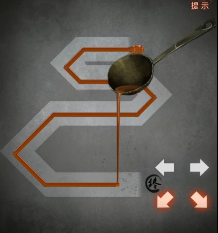 先在做糖画的小锅里把糖葫芦从竹签上取下来,然后十分节约的回收了竹签,之后更加节约的取了个糖画的袋子把山楂给装起来了,要是解密游戏主角都这么节约游戏时间能节省一大半的。把旁边瓶子的糖也放进锅里后就可以开始做糖画了,其实就是个控制的小游戏,通过右下角的方向键控制糖线不要碰到外面就好,完成后放上竹签就获得了龙糖画。