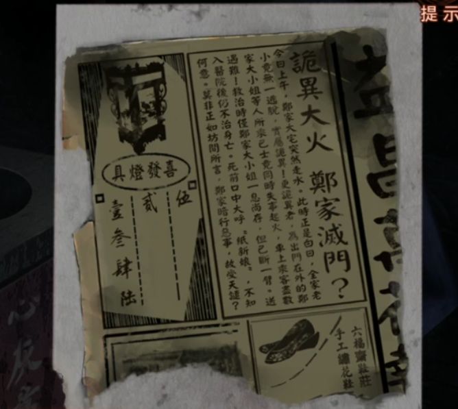 在来到右边场景,多了个锤年糕小人,但是旁边写了有头没脸心灰意懒,自然是首先要用元宝换面具再给他面具才能干活的,不过可以先把山楂扔进去,毕竟东西少了更好思考,小人旁边有张张辰瑞的调查笔记,背面贴着一张剪报,剪报左边宫灯图案下面写着数字,分为三列的数字正对应宫灯三个可拉动的挂穗,所以顺序是左中左左右左。