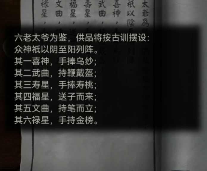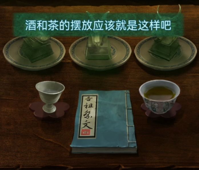 回到外院用修眉刀剪下特别的花,回到正房,左上角柜子把花放进热水变成花茶,然后用茶杯取得一杯花茶,再去右边柜子上面取一杯清酒,然后回到桌子上把茶和酒都摆放在书的两侧,酒阳茶阴所以左边酒右边茶,这样全部物品都摆放完毕了,神像前面暗格打开拿到一把桃木剑,回到内院桃木剑破开门上符咒过剧情。