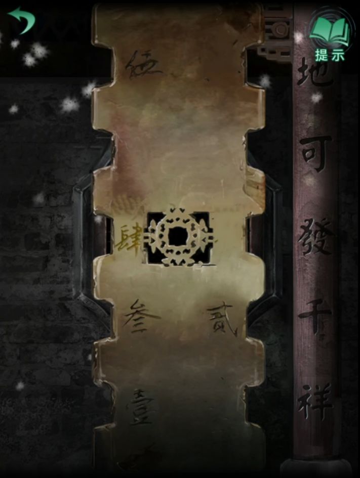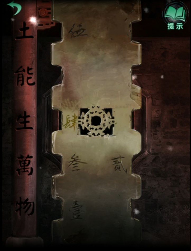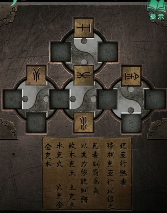 不着急解密再调查一下右边的柜子上,密码提示是五行相克,稍微调整一下会发现下面是有白色的属性的,那么需要做的就是用上面的属性去克制下面的属性,五行相生相克喜欢玩解密的小伙伴一定要背一下哦,敲黑板,调整完毕就能从里面拿到铃铛,还能看到个线索竖向的福禄寿旁边写了112123。