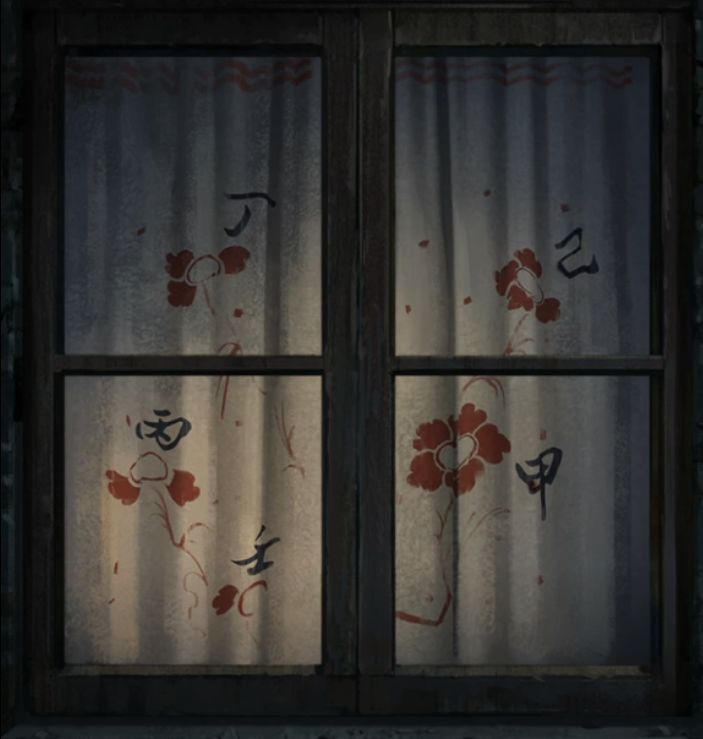 按顺序点完后拿到法器三叉戟,其实法器是个扫把也一样用的,肯定是用来调整上面镜子的,不过也不着急调整我们先回到左边院子偷看小纸人洗澡去,正在看着突然来了个丫鬟纸人把窗帘给拉上了,不给看!不过窗帘是倒是有线索的,按照花瓣的顺序排列这几个字就是壬-丙-丁-已-甲,先记下来这肯定是门口石狮子的线索。