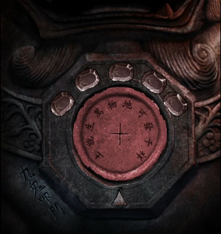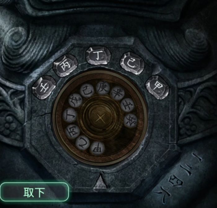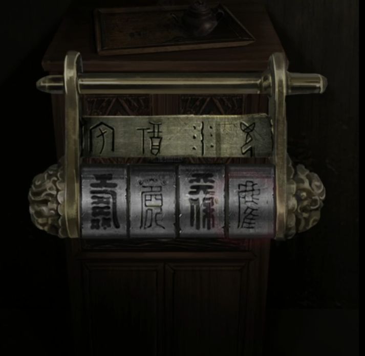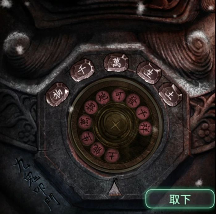 来到门外石狮子,把拨号盘放在左边石狮子上,转动拨号盘让需要的字刚好停在下面指针一秒就可以输入了,如果不好调整可以利用空白地方让指针停留一下下,调整完毕就能拿到一把钥匙,来到左边庭院刚刚偷看纸人洗澡的房间用钥匙打开锁进门。