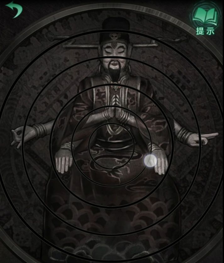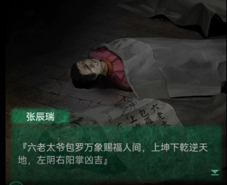 调整完毕打开盒子获得一个密码尺,尺子中间的那个图案看起来很眼熟啊,不就是门外窗子的图案吗,不过不着急走,先把地上的白布都掀开,里面是三个纸人没高能,中间纸人头顶有个牛雕像拿走,下面白布掀开有线索,比较重点的是左阴右阳记下来。