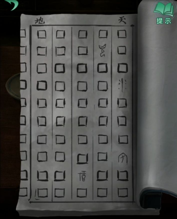 最后一页还有线索,这时候方格草纸的好处就显示出来了,方框直接画一道,然后对应位置写上鬼画符,这里还要注意左边写了个地右边写了个天,这个密码怕不是要左转90度用的,不过记得时候还是竖向记就好哦。