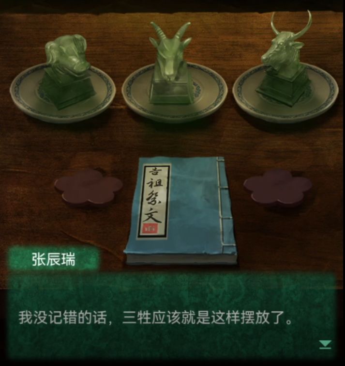 把铃铛挂在盆对面的架子上,把猪和羊放到桌子上面盘子里,这里注意一下,按照前面提示左阴右阳,从阳到阴是猪羊牛,我们的顺序应该是牛羊猪,但是,不知道这里的左右到底是以玩家还是神像为坐标的,所以摆好没有反应可以再换过来试一下猪羊牛,这时候提示是这样摆放,得出结论这个左右是神像的左右。
