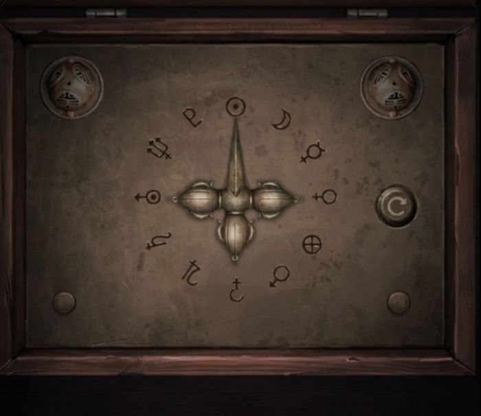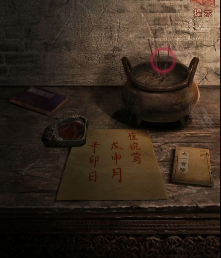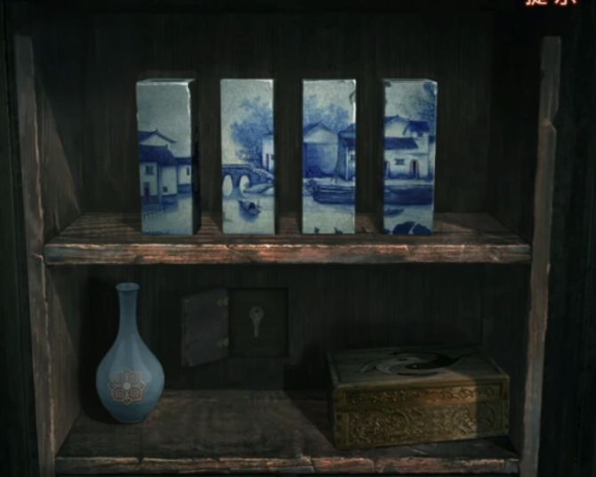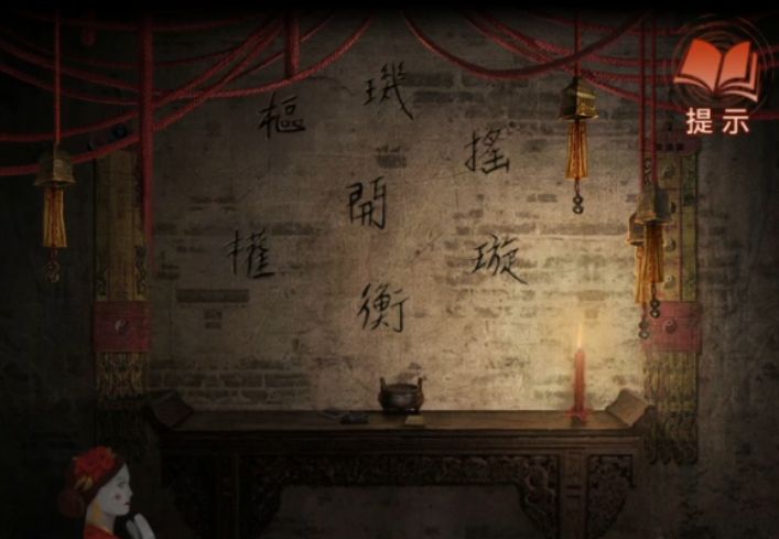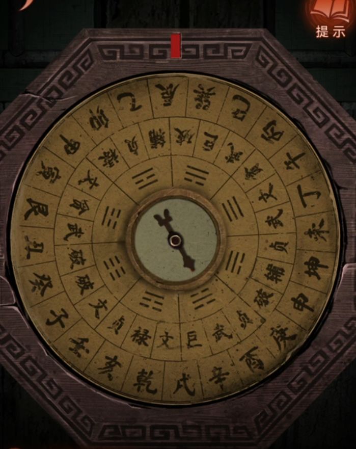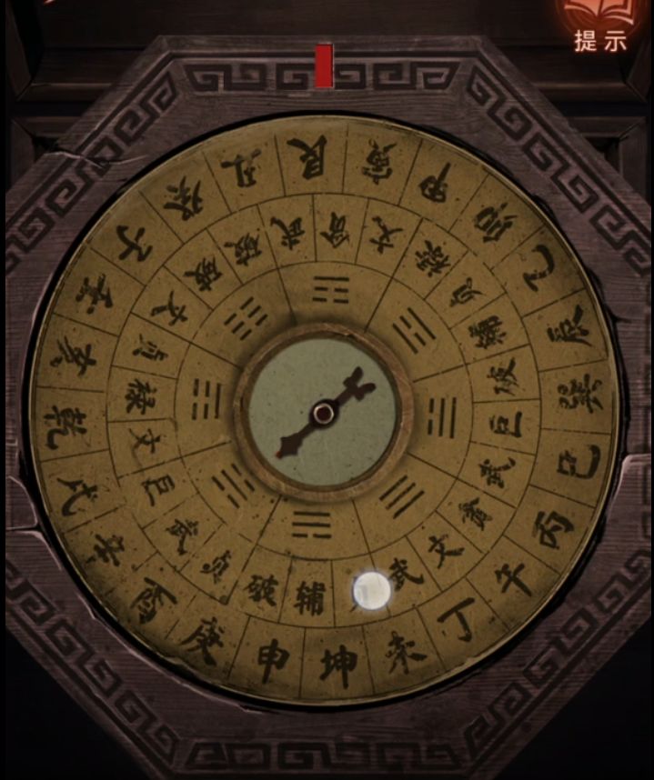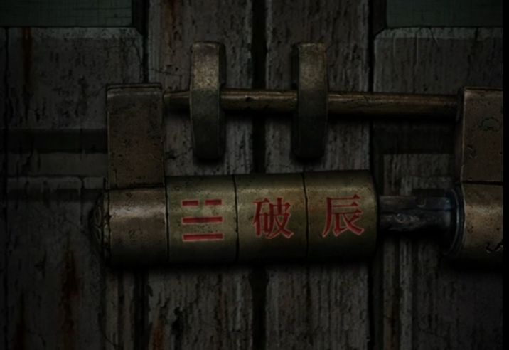 然后不需要研究直接过剧情吧,剧情过后拿着风水盘来到三位数门锁密码旁边,掏出风水盘把指针对准红点,上面红色所对应的是辰、破、☱,所以门的密码就是☱破辰,调整完毕打开门,放心虽然有个纸新娘但是这次一点高能都没有。
