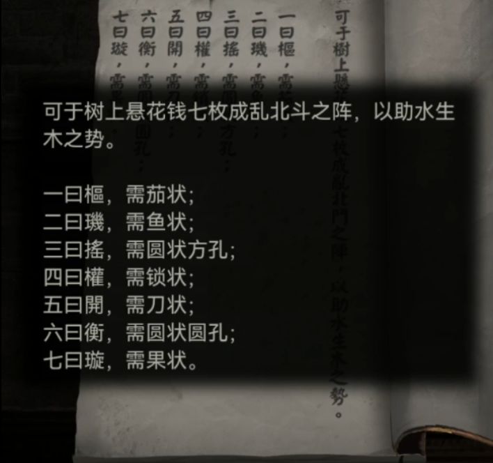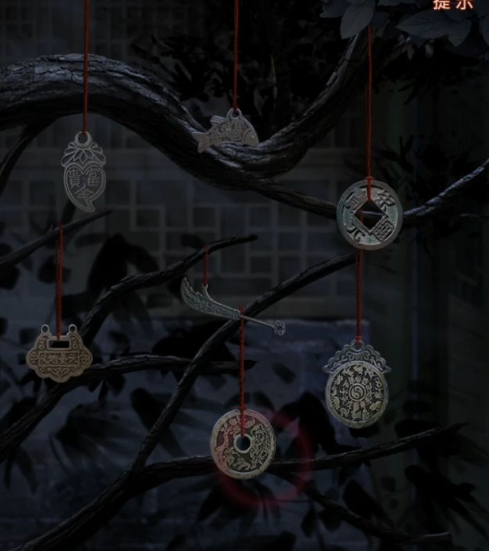 这样我们树上挂的古钱顺序就齐了,调整为第一行是茄状-鱼状-圆形方孔,第二行是锁状-刀状-果状,第三行就一个圆形圆孔,调整完毕后拿到一个小发条,我们里面的吹箫木偶好像有个发条孔,回屋里。
