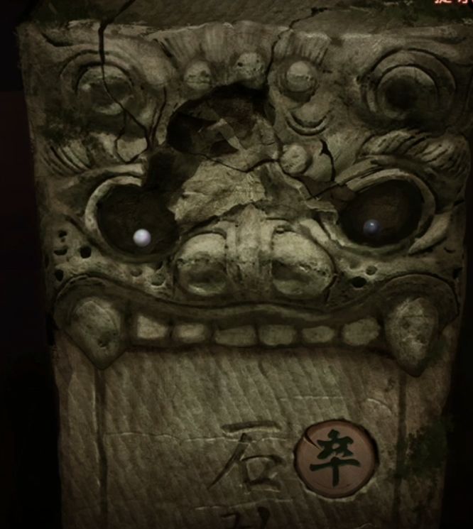 刚刚的石敢当胸前就有一个圆洞,把黑色的卒放进去石敢当的两只眼睛裂开了,露出里面一黑一白两个珠子,这画面有点像石敢当两只异瞳盯着鼻子,有点可爱啊!拿着珠子回到屋里柜子上的阴阳鱼盒子,放上去拿到风水盘。
