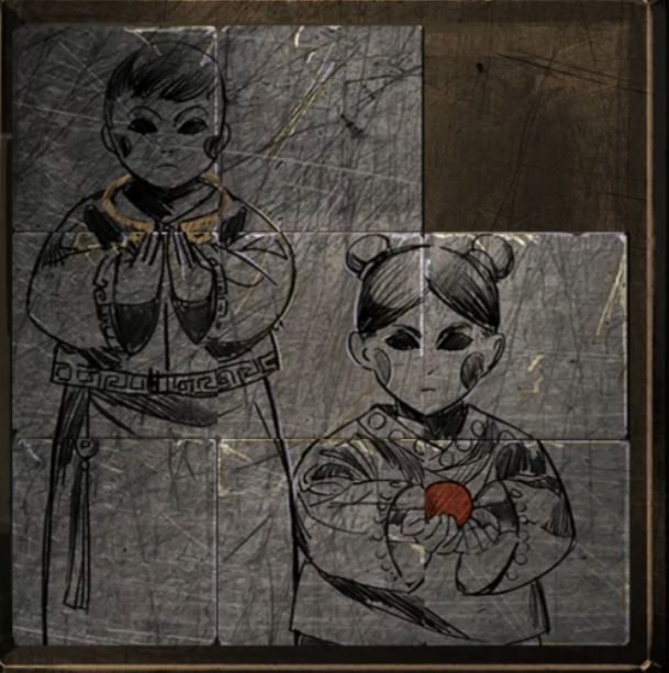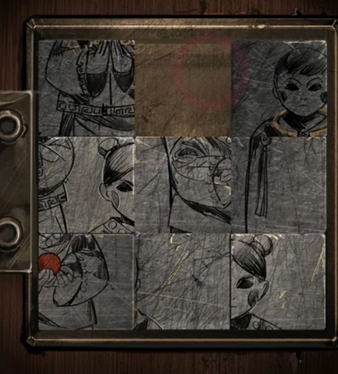 金项圈顺手给旁边男童戴上就可以了,放心戴没有高能,回到最开始的房间把拼图碎片放在柜子左边的机关上就可以开始拼图了,嗯,很讨厌的空格拼图,不过下面是有参照物的应该说降低了一点点难度,完成拼图后柜子左边打开,碰触绣花鞋剧情后拿到红色珠子。