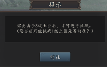 玩家需要根据寇匪等级由低到高开启挑战,在尚未击杀过低级寇匪时,无法越级挑战更高级寇匪,系统将进行提示并推荐玩家前往至附近符合条件的坐标点。