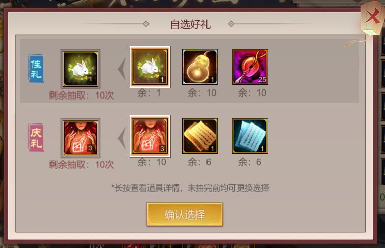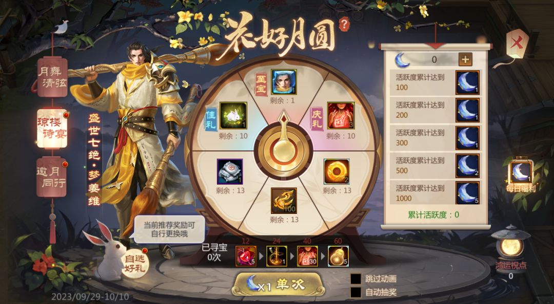 仙术师可自选佳礼、庆礼物品加入奖池,奖励寻宝完后不会重复抽取。活动期间累计活跃度可获得对应月缘石奖励,累计寻宝次数可领取对应的道具奖励。