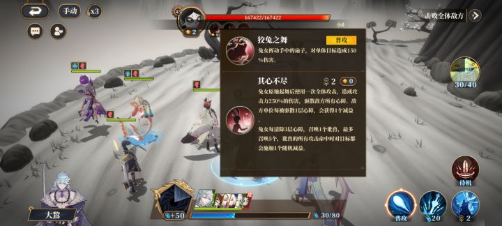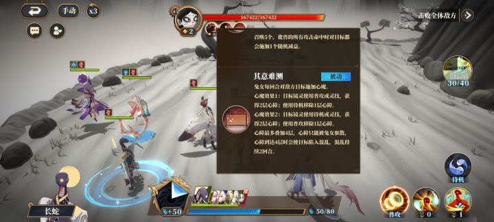 先看下boss机制,如图,因为被动的存在导致boss的大招非常恶心,一旦被触发心魔状态,那就是被控到死,不可驱散。所以核心攻略方法就是不被boss两回合的大招触发被动,下面我就具体讲攻略流程。