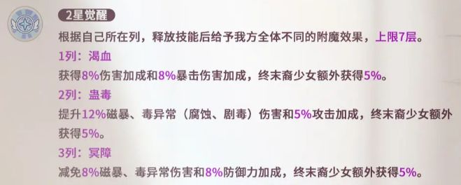 这个附魔增加跟二星觉醒的附魔是不会重复的,例如卡莲在一号位,她完成进化行动后并不会给最高攻击少女加两层渴血,一层蛊毒和冥障,而是一层全部附魔。