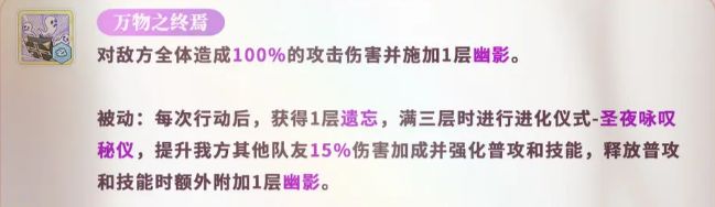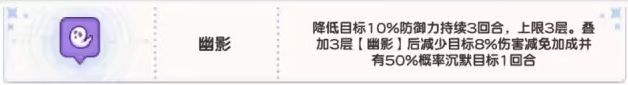 【幽影】:降低目标10%防御力持续3回合,上限3层。叠加3层【幽影】后减少目标8%伤害减免加成并