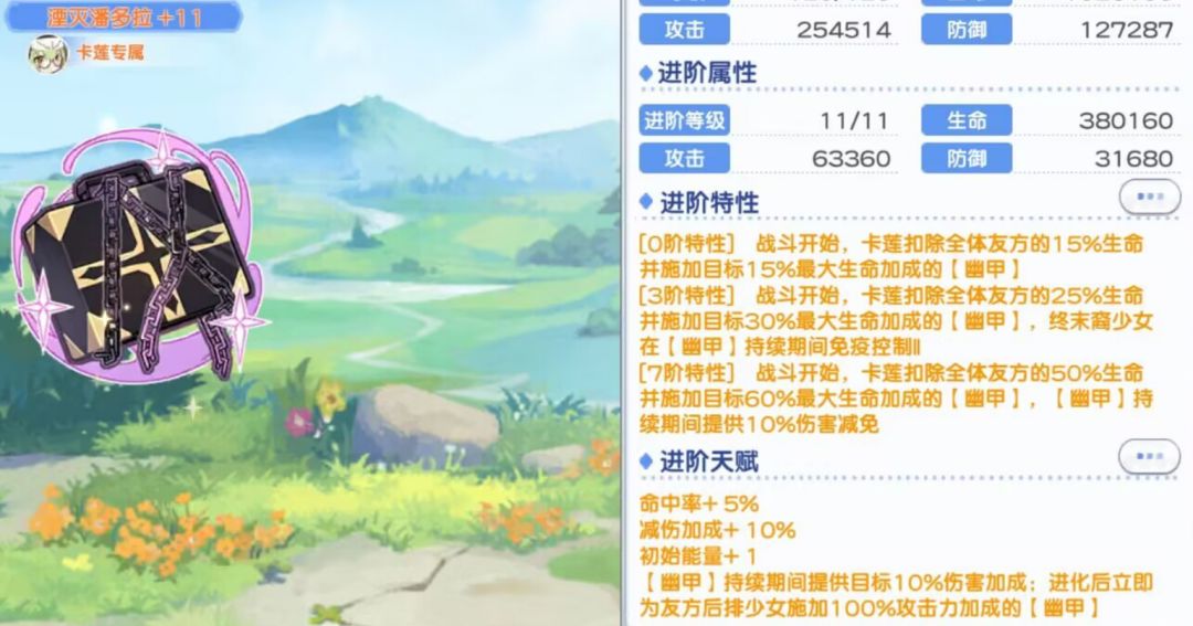 (ps:虽然目前没有什么作用,但跟光道使露妮娅一样,三星觉醒给卡莲加了比其他少女更多的三维属性)
