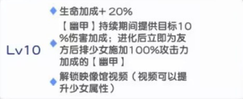 心之所向一有两个效果:第一点刚刚已经讲过啦,几乎是无条件的增伤;第二点就进化后直接给予后排100%攻击的【幽甲】。