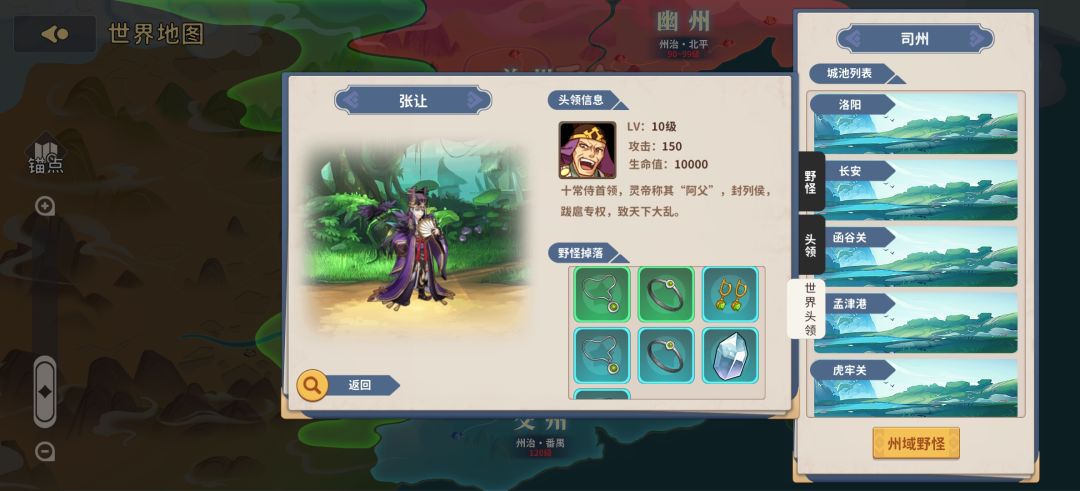 这里的敌人主要出产主线任务道具等,跟着指引走就可以了。boss十常侍,主要掉落附魔图纸与材料。世界头领两个,也就是多数世界头领都掉的饰品类装备与强化材料。