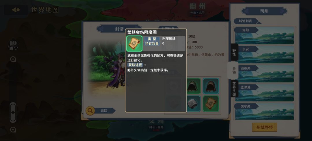 这里基本就是升级打怪,boss掉落也都是装备之类,普通头领就不提了,需要着重提及的是来发福利的两个世界头领,掉落增加背包格子卷轴与三级锻造卷轴的俩家伙。