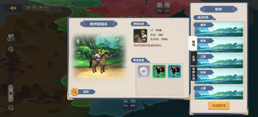 这里一样地块众多,只提及两个刷马匹的地方吧,赤壁港与猇亭关。40级蓝品质黑鬃马,轻骑兵掉落,队长也可以打,他身后的也都是轻骑兵。