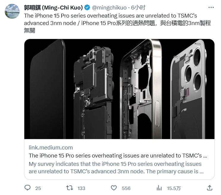 台积电3nm不背锅 郭明錤:iPhone15 Pro过热是散热问题
