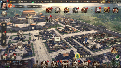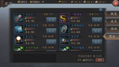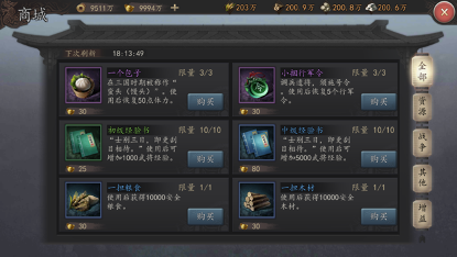 商城:商城内每日可购买道具的价格和数量固定,商城中所有的道具都只能使用元宝购买,其中道具主要分为4类:资源类、战争类、增益类和其他。资源道具每日限量购买,而战争类的道具则不限制购买次数。