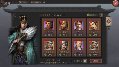 酒肆:酒肆属于主城内的固定建筑,当主公完成伍-秣马厉兵任务即可开启。酒肆主要通过消耗信物来购买武将好感度。