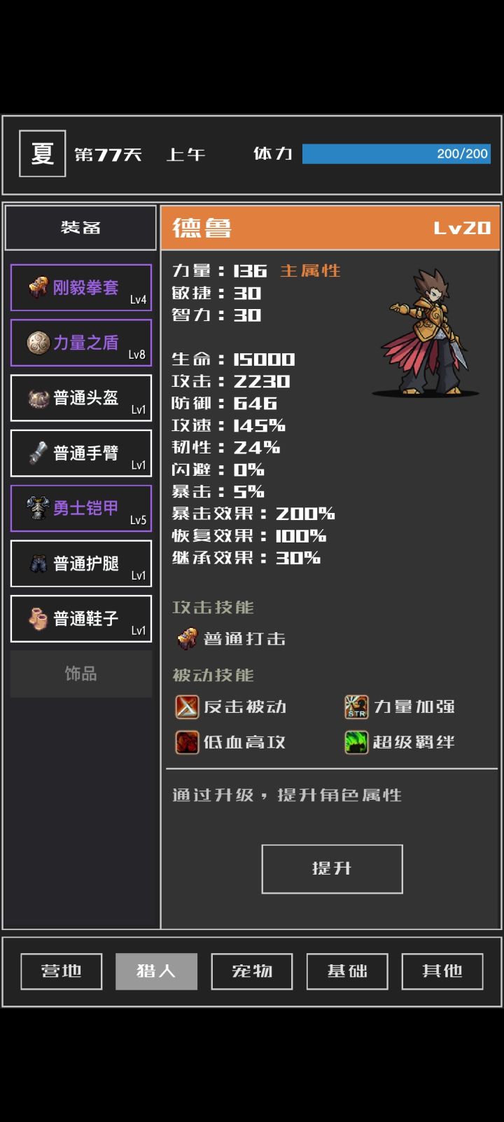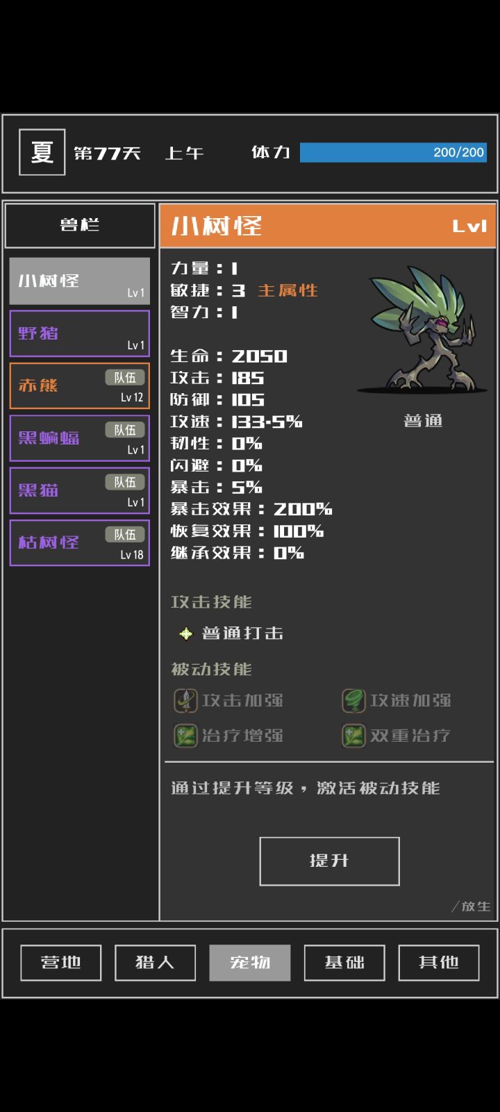 优先养主角,后面主角的属性继承30%给宠物,德鲁一万血继承下去,配合枯树妖群奶(必抓,15级就够用了,升级资源要水果和主角不冲突),队里1级脆皮输出都没死过(没资源养)。