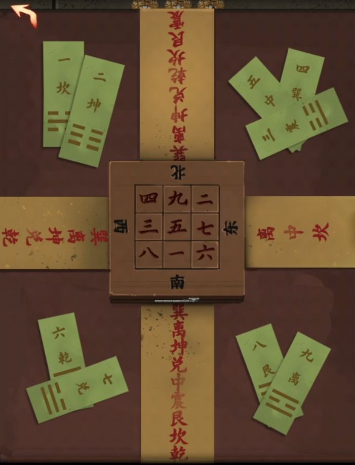 剧情过后要给道长找铜钱,这里没有太多线索就一个放了八卦和数字的盒子,首先记下来1坎2坤3震4巽5中6乾7兑8艮9离,然后找个小本本,把木盒上的数字都换算成八卦,也就是第一行巽离坤,第二行震中兑,第三行艮坎乾,四个方位有四张长条,先右边最短的离中坎,把这三个连线后就是个竖线,也就是数字1,记下来东=1。然后左边的巽离坤兑乾做个连线是个折线也就是数字7,记下来西=7。上面的巽离坤兑乾坎艮震做个连线是个缺了一个小短边的0,暂且记作北=0。下面的巽离坤兑中震艮坎乾做个连线是数字2,记下来南=2。