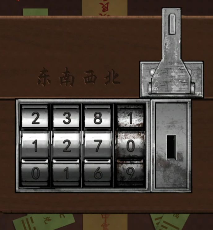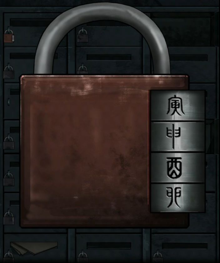 整理一下也就是从上到下为庚申西灭,回到信箱点左上角密码锁解密,调整为庚申西灭,锁打开获得楼道的钥匙,点击上楼然后点左边房间701就可以继续剧情了。