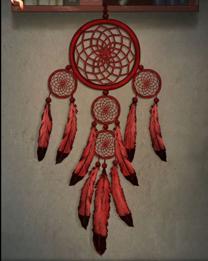 墙上有个捕梦网,单看这个好像是没有任何线索的,所以需要结合桌子上密码本的图案来看,捕梦网是上面一个大圆下面吊着几个小圆,如果不管大小的话和日记本上图案排布是几乎相同的,网是完全一样的,下面吊着的羽毛也没有太大区别,所以我们需要把每个圆下面吊着的羽毛全部算上,这样的话最上面大圆吊着下面所有羽毛也就是9根,中间的圆只吊着自己和最下面的也就是5根,左右都是只吊着自己下面的2根,最下面的是3根,所以密码就是最上面9中间5下面3左右都是2。