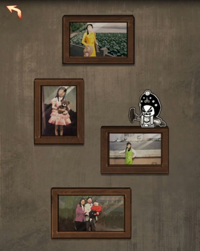 出门后直接无视女鬼回到客厅,我们手里还有一把钥匙没有用,而客厅刚好还有一个柜子缺一把钥匙,用钥匙打开柜子后是四个颜色小人偶,小人偶颜色和上面相片里衣服颜色相同,那肯定就是衣服线索了,而且其中一个相框上海有个纸片人偶,相片以女主衣服为准高度从上往下为黄-粉-绿-红。