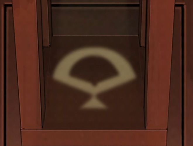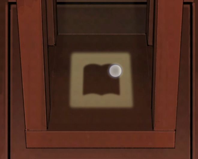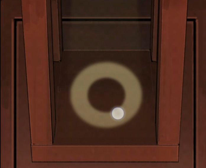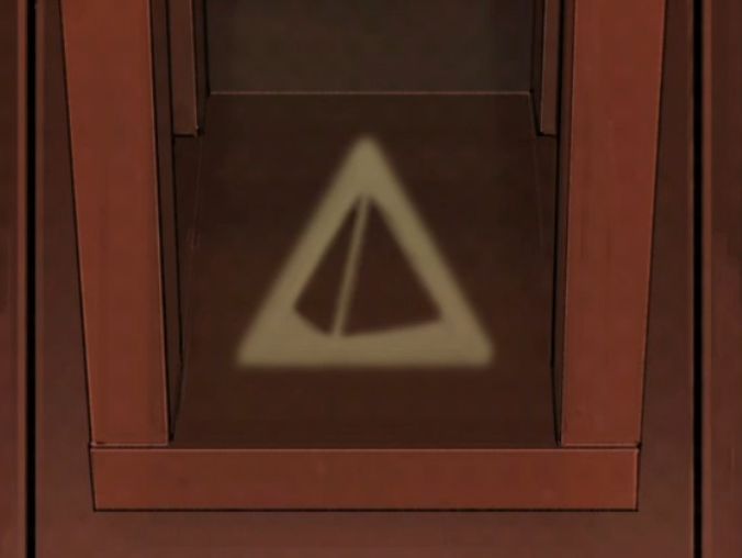 打开右边柜门,看到密码盒,按照这个位置调整密码盒上木块位置,打开看到一个灯,看形状就和楼下的门上图案一样,不过不是拿到门上用的,而是就在柜子上面有个插座,把灯插上后就开始自己转动起来。